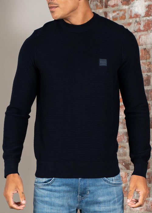 Deze Hugo Boss Trui combineert een rijke structuur met een zachte mix van katoen en kasjmier. Het regular fit design en de subtiele logopatch op de borst maken dit een tijdloze essential voor elke garderobe.