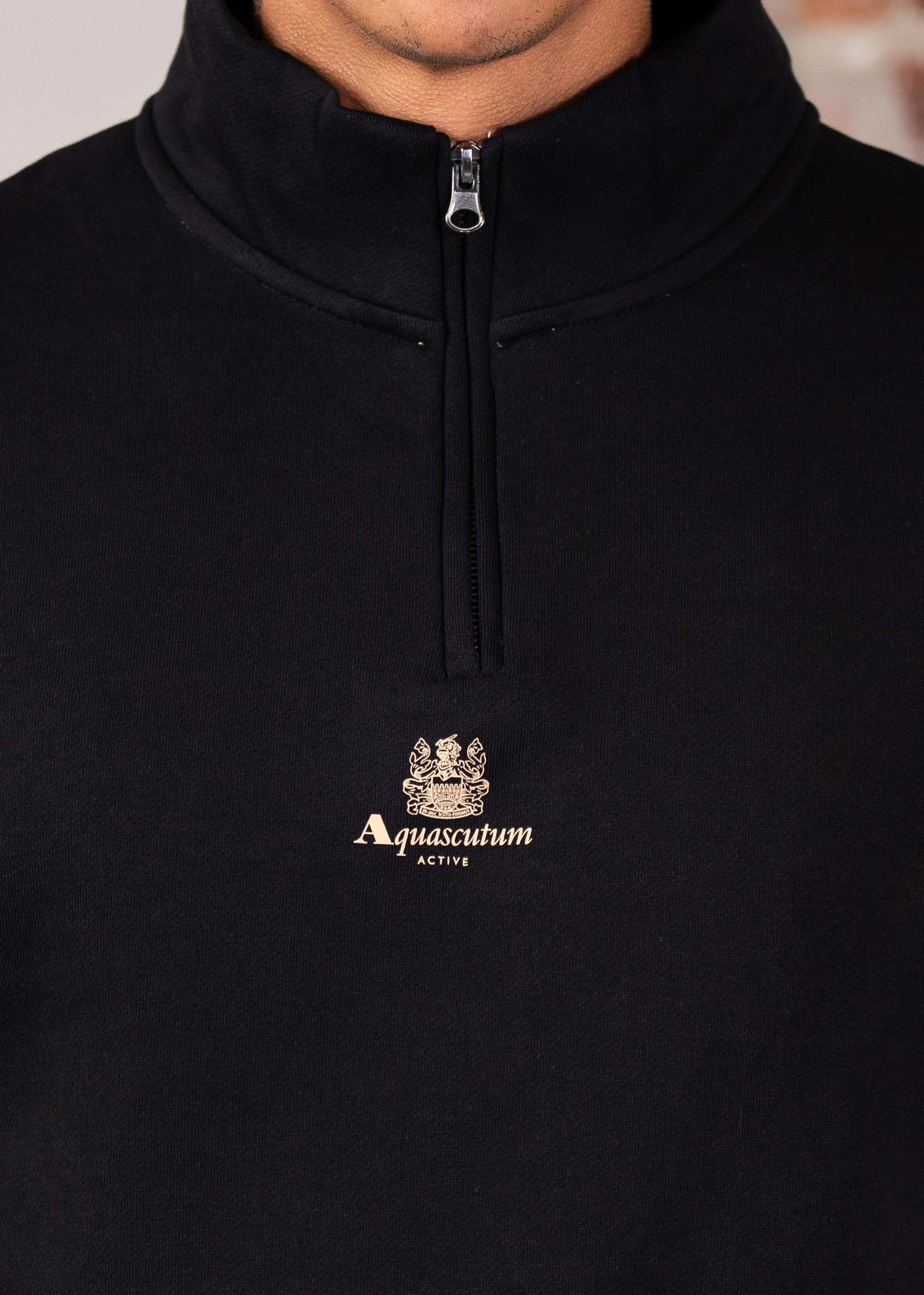 De Aquascutum Active Quarter Zip Sweatshirt combineert sportieve functionaliteit met een cleane uitstraling. Gemaakt van zacht 100% katoen brushed fleece, met een mockneck en kwart rits en afgewerkt met het centrale Aquascutum Active logo en Crest op de borst.
