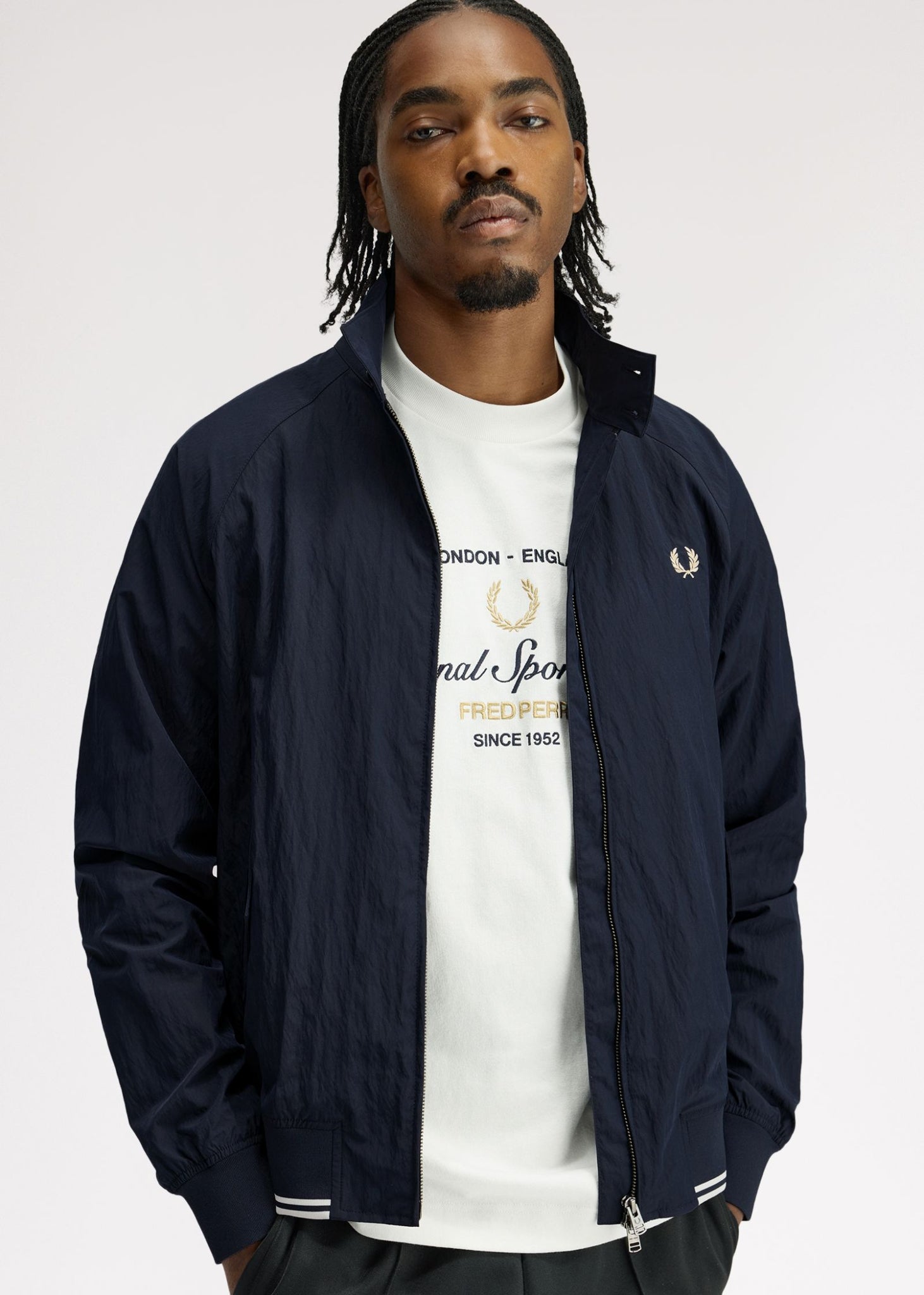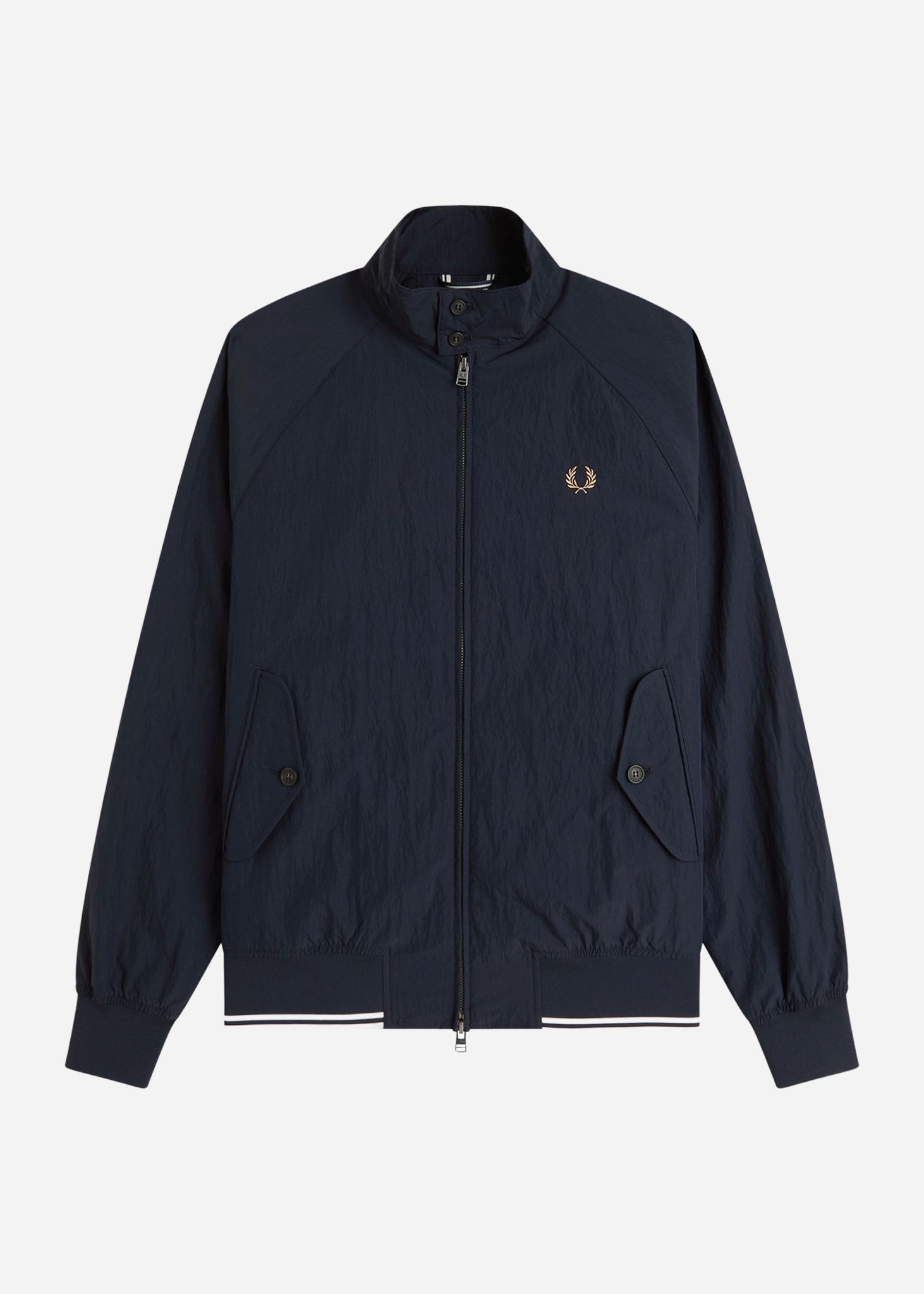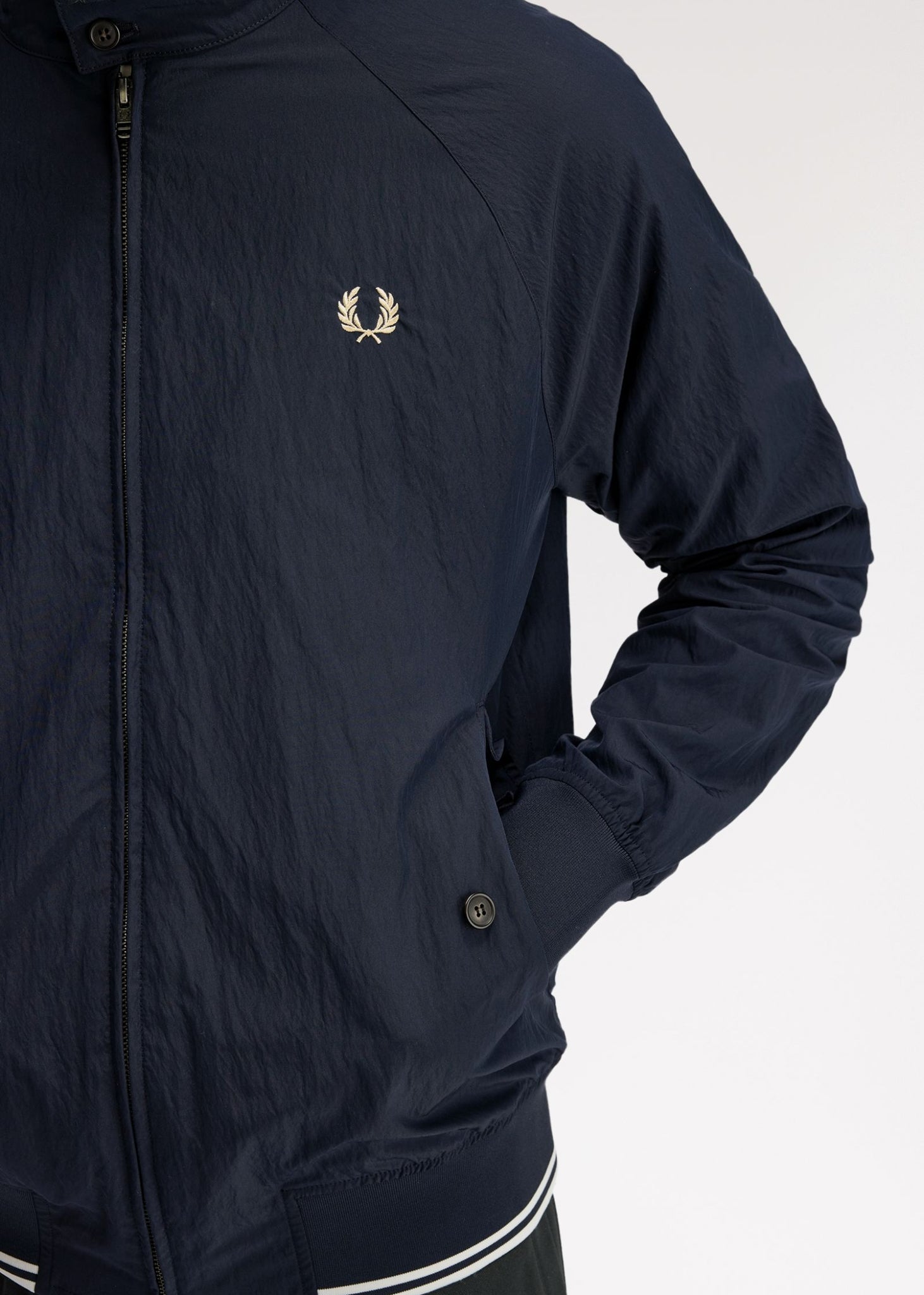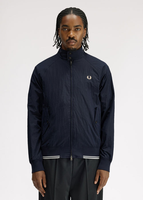 De Fred Perry crinkle Harrington jacket heeft een strak silhouet met extra textuur. Licht en comfortabel voor dagelijks gebruik.